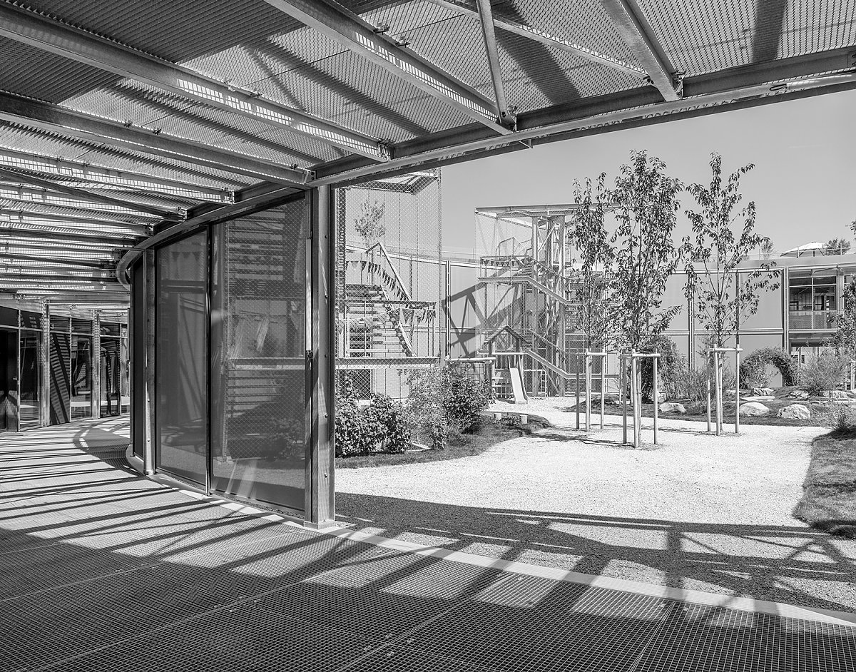 Der Ort ist geprägt durch die Topographie des Hanges an der Schnittstelle zweier Siedlungsteile und begrenzt durch Hauptstrasse und Bahn. Mit der selbstbewussten Setzung des Neubaus erhält die Schulanlage die notwendige Präsenz. Dabei wird die Topographie zur Etablierung eines zentralen Ortes für die Schule genutzt.
