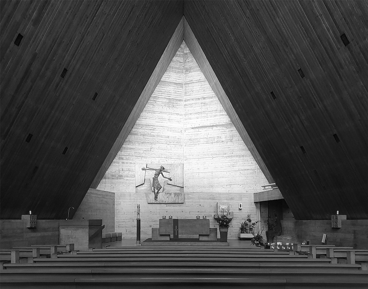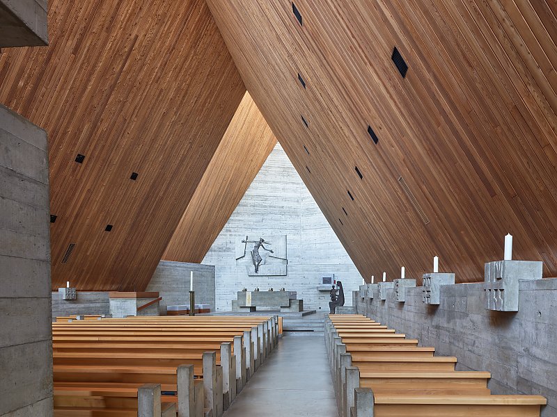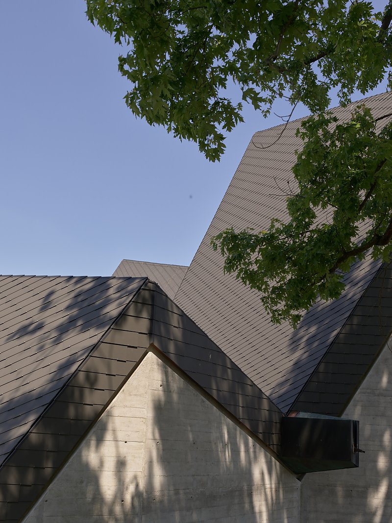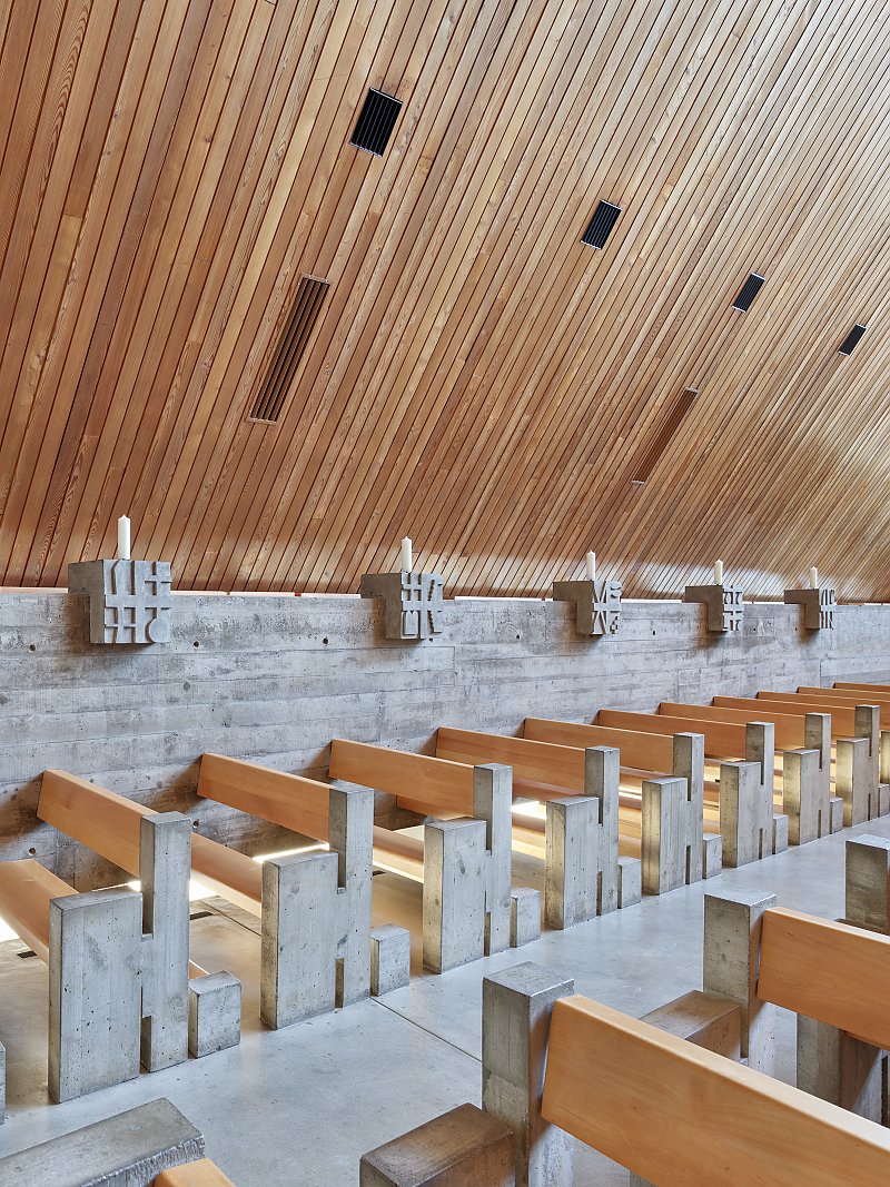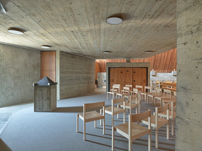 Unser denkmalpflegerisches Konzept für die Erneuerung der Kirche und den Umbau der ehemaligen Pfarrwohnung baut architektonisch und strukturell auf dem starken Ausdruck der Architektursprache mit den verwendeten Materialien Sichtbeton, Holz und Eternitschiefer auf.