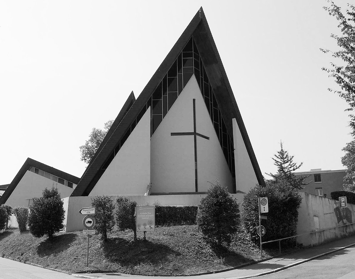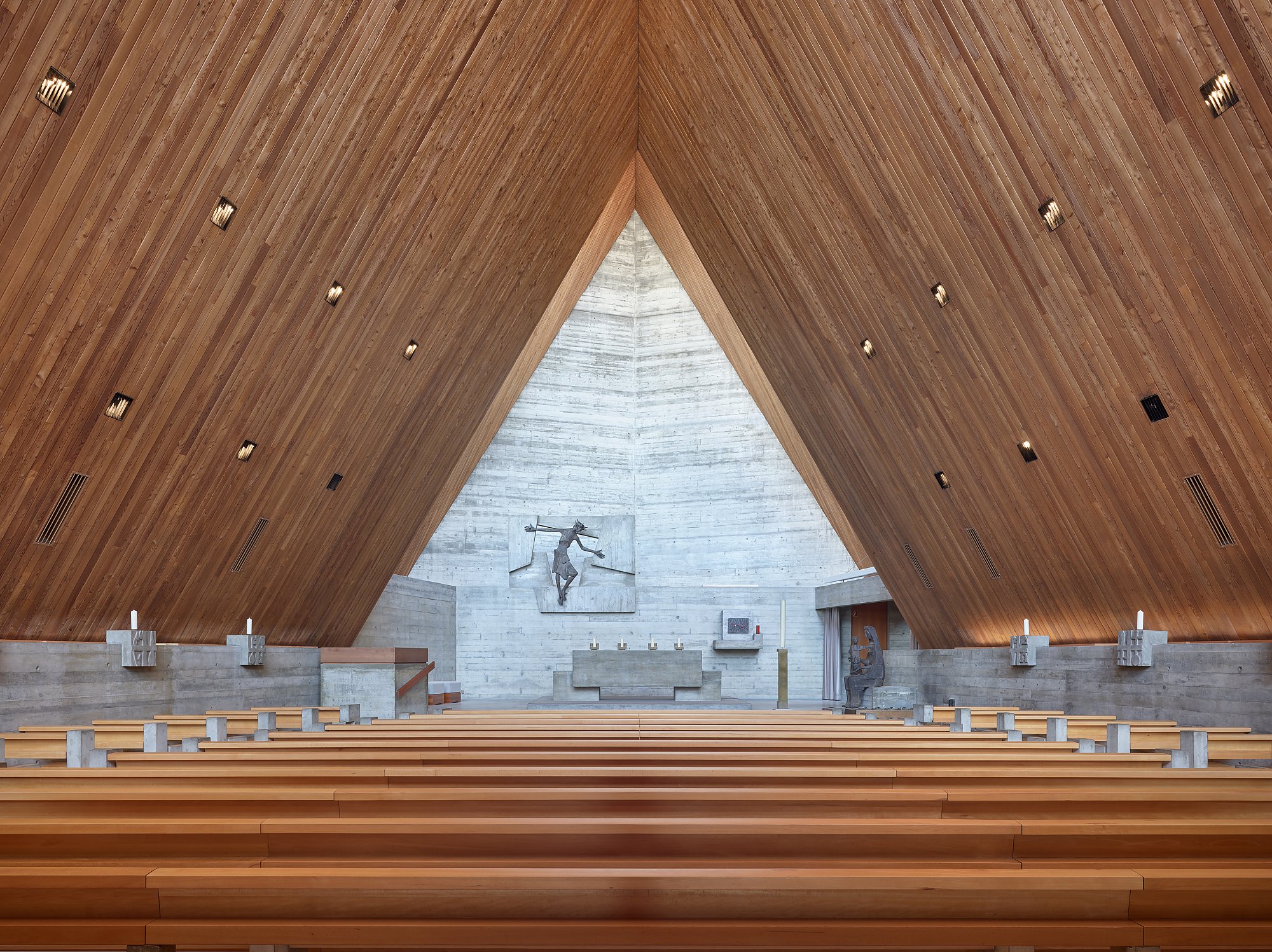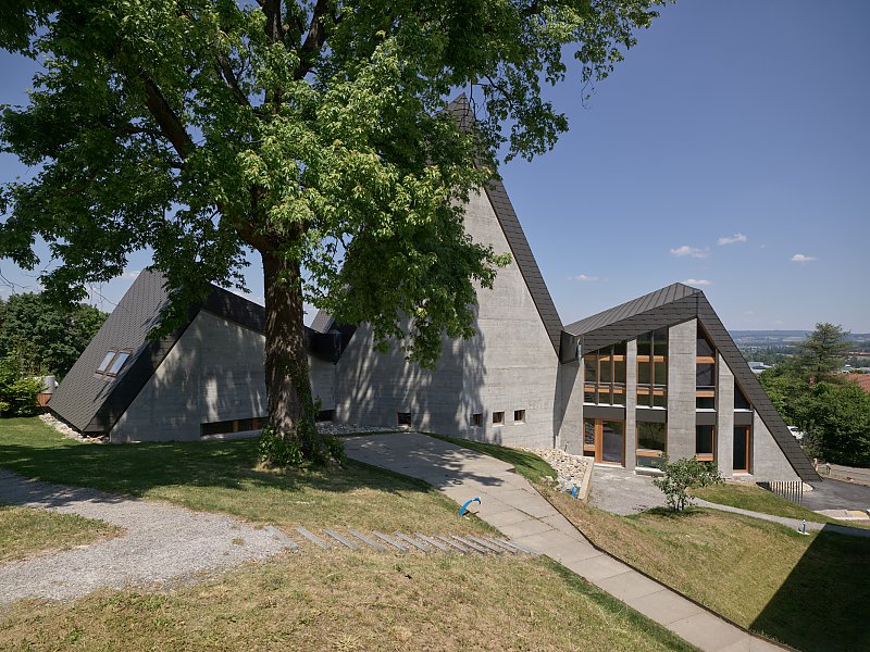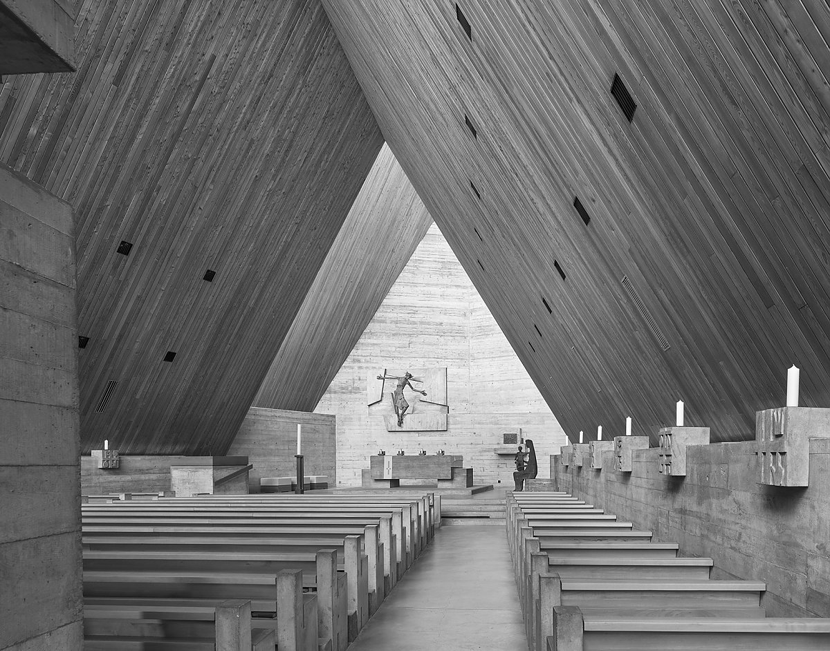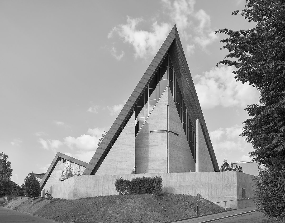 Unser denkmalpflegerisches Konzept für die Erneuerung der Kirche und den Umbau der ehemaligen Pfarrwohnung baut architektonisch und strukturell auf dem starken Ausdruck der Architektursprache mit den verwendeten Materialien Sichtbeton, Holz und Eternitschiefer auf.