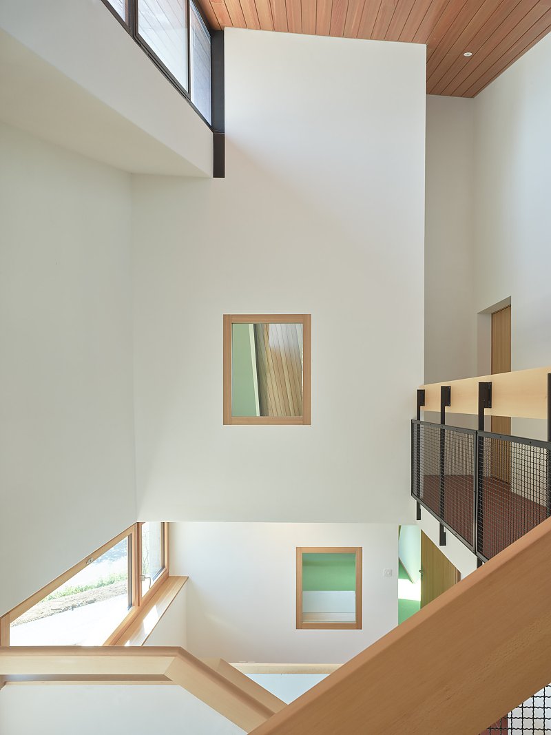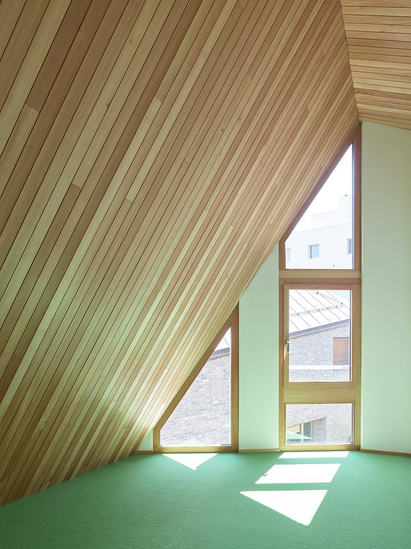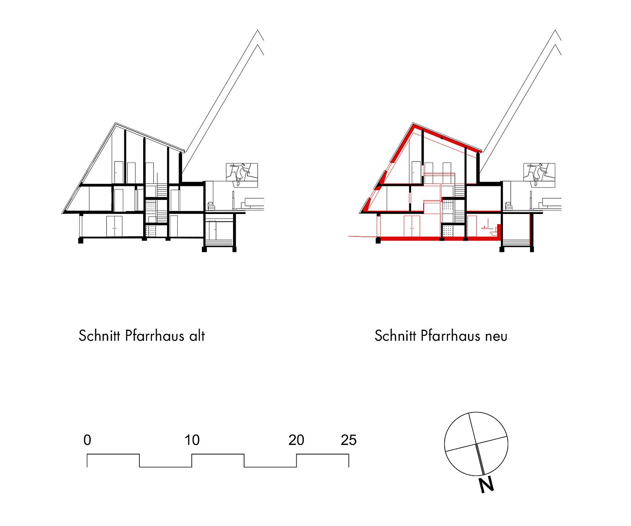Den allgemeinen Erneuerungsbedarf und die Anforderungen an den zukünftigen Betrieb als Pfarramt nutzen wir als Chance zur Aufwertung der Raumqualitäten in der bisher architektonisch unbedeutenden Pfarrwohnung. Eine offene Treppenanlage ergibt spannungsvolle Sichtbezüge über die Geschosse. Die ehemalige Garage öffnet das Pfarramt zum Raumkontinuum der Treppenanlage und stellt so den direkten Bezug zum Ergänzungsbau des Pfarreizentrums her. Die architektonische Gestaltung wird in Zukunft auch hier durch Materialien Sichtbeton, Holz und die Lichtführung geprägt werden.
