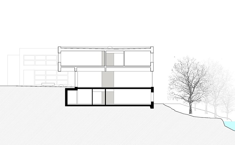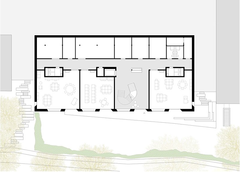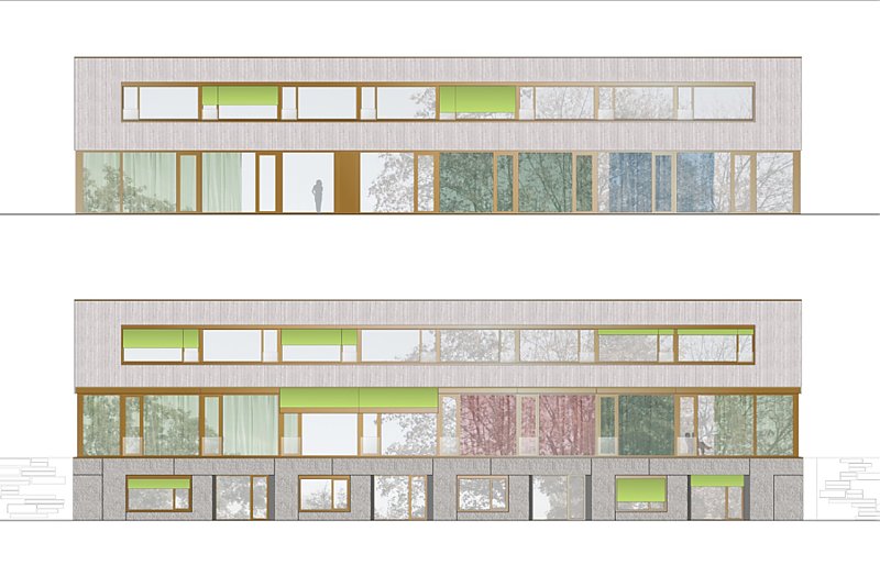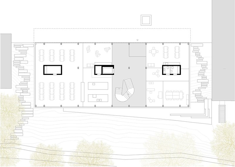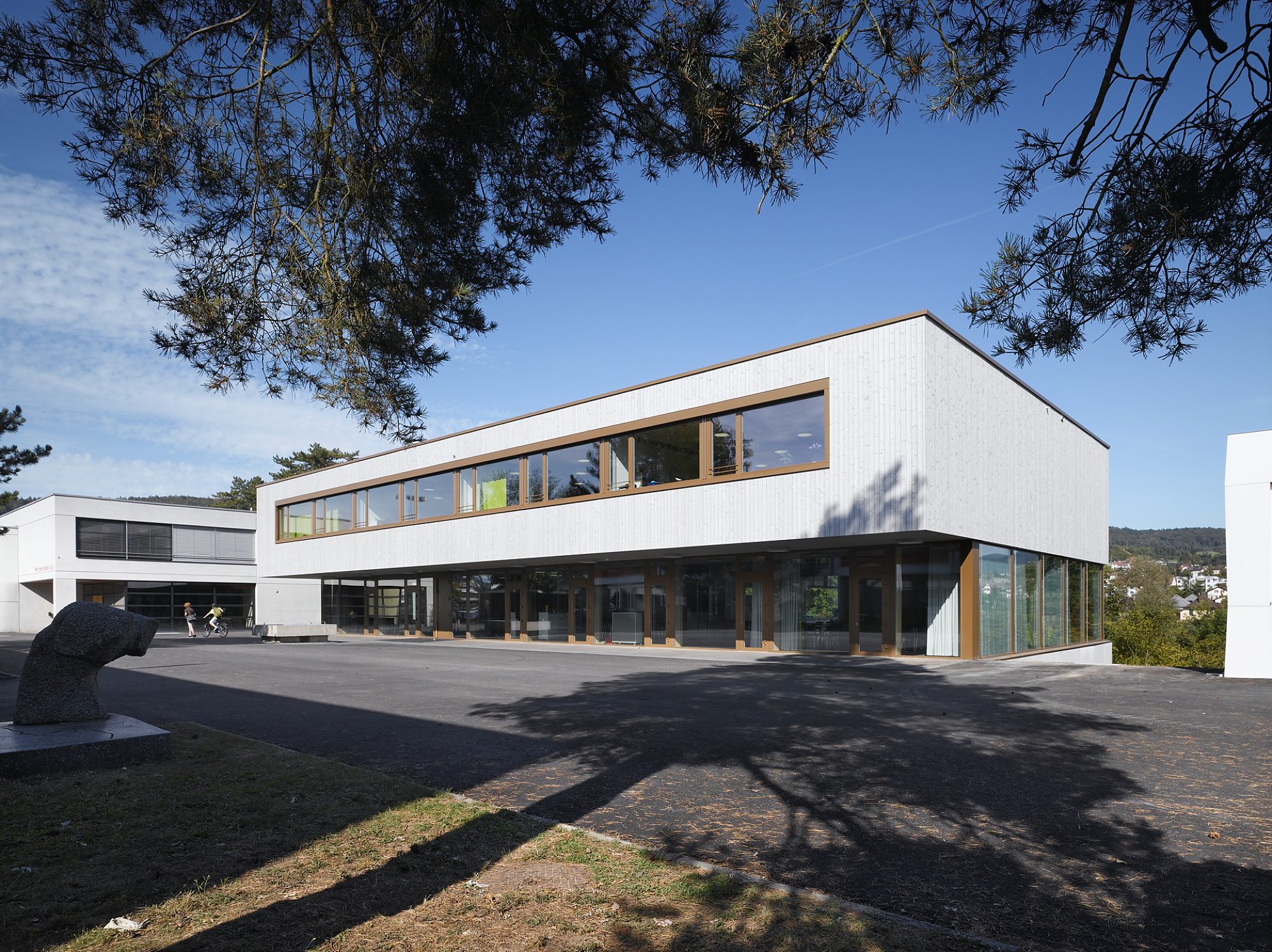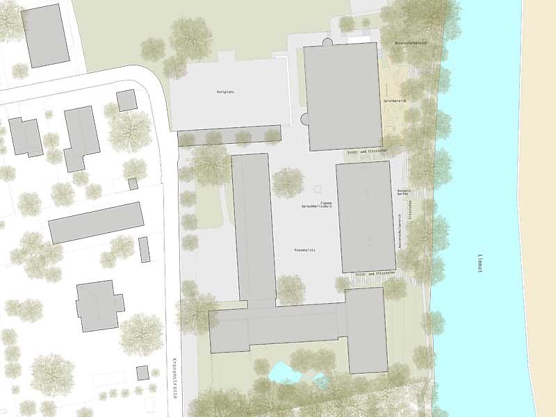 Drei Ebenen organisieren die städtebauliche Situation, das Gebäude und die Nutzung: Ein transparentes Erdgeschoss mit allen öffentlichen Nutzungen verbindet Pausenplatz und Limmatraum. Ein Holzvolumen fasst mit seiner Auskragung den Pausenplatz und bildet ein Gegenüber zum bestehenden Gebäude. Ein Gartengeschoss in Beton formuliert den Übergang zum Flussraum und zum Aussenraum der Sprachheilschule.