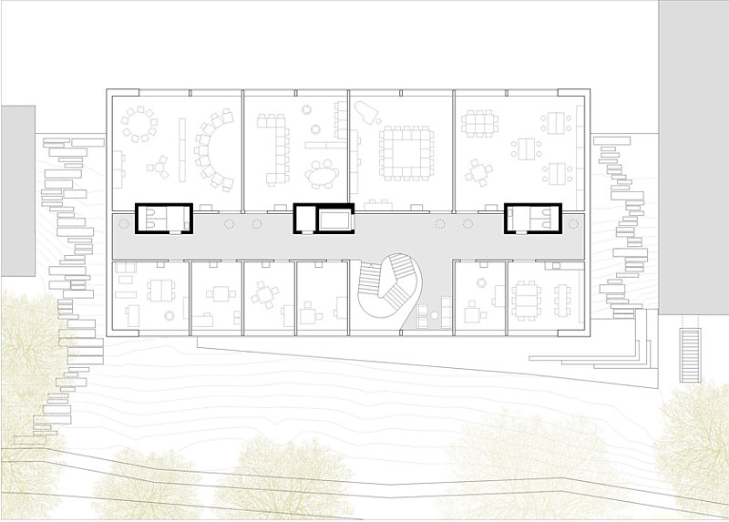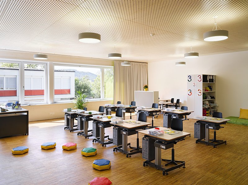 Das städtebauliche Konzept zeichnet sich in der Organisation des Raumprogramms ab. Im transparenten Erdgeschoss finden alle Räume mit einem erhöhten Anspruch an Öffentlichkeit wie Tagesstrukturen, Esssaal und Verwaltung Platz. Im Obergeschoss bilden vier Klassenzimmer zusammen mit den Therapieräumen eine klare Nutzungseinheit. Im Gartengeschoss befinden sich der Kindergarten, Spezialschulräume wie Musik- und Werkraum sowie die Nebenräume.