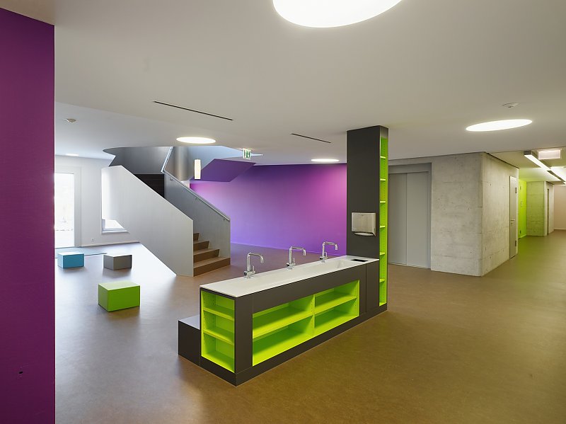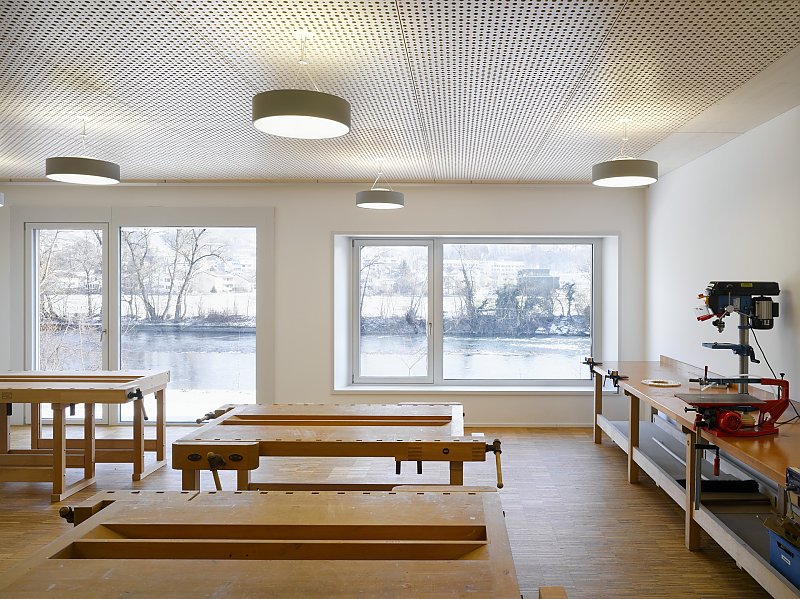 Kenndaten | GV: 7'100 m3; NF (Schulräume, Tagesstrukturen, Werkstätten, Speisesaal, Therapieräume): 1'950 m2 |