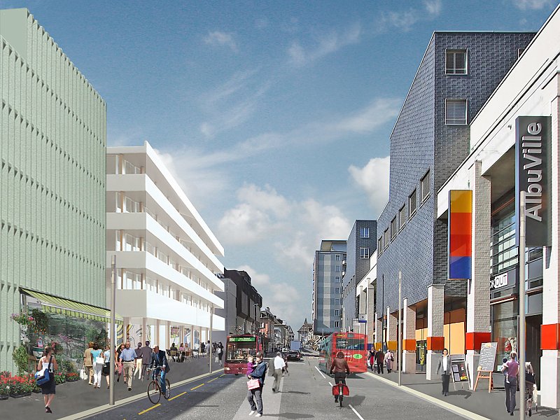 2. der Neugestaltung der Neuen Jonastrasse – St. Gallerstrasse als Identität stiftendes Element: die Verbindungsstrasse wird verkehrlich neu konzipiert (Stärkung des Langsamverkehrs und Dosierung des motorisierten Verkehrs). Eine zurückhaltende und gleichzeitig markante Gestaltung über die gesamte Achse bildet das Rückgrat für die Entwicklungen im Umfeld und ist sichtbares Zeichen für die Verbindung der gestärkten Zentren.