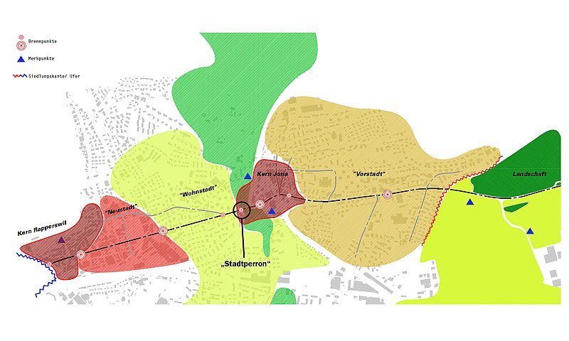 Mit der Fusion der Städte Rapperswil und Jona soll die „Doppelkernstrategie“ gestärkt und aufgewertet werden. Das Rückgrat dieser Verbindung - der Stadtraum entlang der Neuen Jonastrasse – St. Gallerstrasse - ist geprägt durch die “Entwicklungsringe“ der Stadtentwicklung beider Zentren. Der Vorschlag baut auf den vorgefundenen Strukturen und deren Qualitäten auf. Es wird ein robustes stadträumliches Entwicklungskonzept vorgeschlagen, das flexibel auf zukünftige Anforderungen reagieren und etappenweise voran getrieben werden kann.