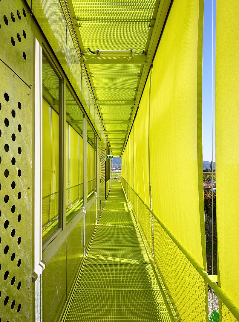Der Bauplatz ist geprägt durch die Nachbarschaft von flächigen 2-geschossigen Schulbauten und punktförmigen 3-4-geschossigen Wohnbauten. Das Gebäude der Sprachheilschule bezieht sich in seiner Volumetrie auf die bestehenden Schulgebäude. Das Gebäude wurde in Holzelementbauweise auf einem UG aus Ortbeton erstellt. Anfang Januar 2014 wurde der Bau innert zehn Tagen aufgerichtet. Anschliessend erfolgte der Ausbau und die Fassade wurde montiert. Diese rasche Bauweise ergab, dass das Gebäude innerhalb eines knappen Jahres erstellt werden konnte und zum Schulanfang 2014 bereit stand. Der Aussenraum gliedert sich in einen befestigten Zugangsbereich und einen unterschiedlich nutzbaren Gartenbereich. Räumlich geprägt wird die Schule pro Geschoss durch vier Volumen, zwei Einschnitte und eine fliessend-verbindende frei nutzbare Fläche. In den Volumen befinden sich die ruhigeren Unterrichtsräume, die 2-geschossigen Einschnitte beinhalten die Eingangs- und die Spielhalle und der fliessende Raum entspricht der Erschliessungsfläche und den öffentlicheren Räumen. Die Entfluchtung des Obergeschosses geschieht über die vorgehängte Laube, welche das Gebäude auch architektonisch prägt. Alle Schul- und Therapiezimmer haben direkten Anstoss an die Laube – diese wird zur räumlichen Erweiterung der Unterrichtsräume. Durch die klare räumliche Organisation ist eine einfache Orientierung und eine vielfältige Bespielbarkeit im Schulhaus gesichert – das Schul-Haus wird zum Lern-Haus.