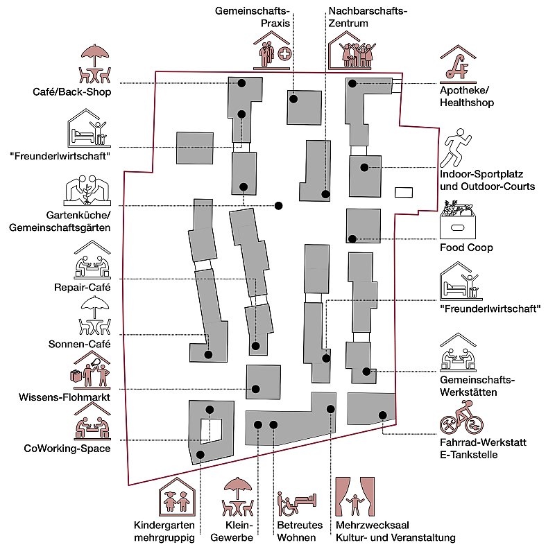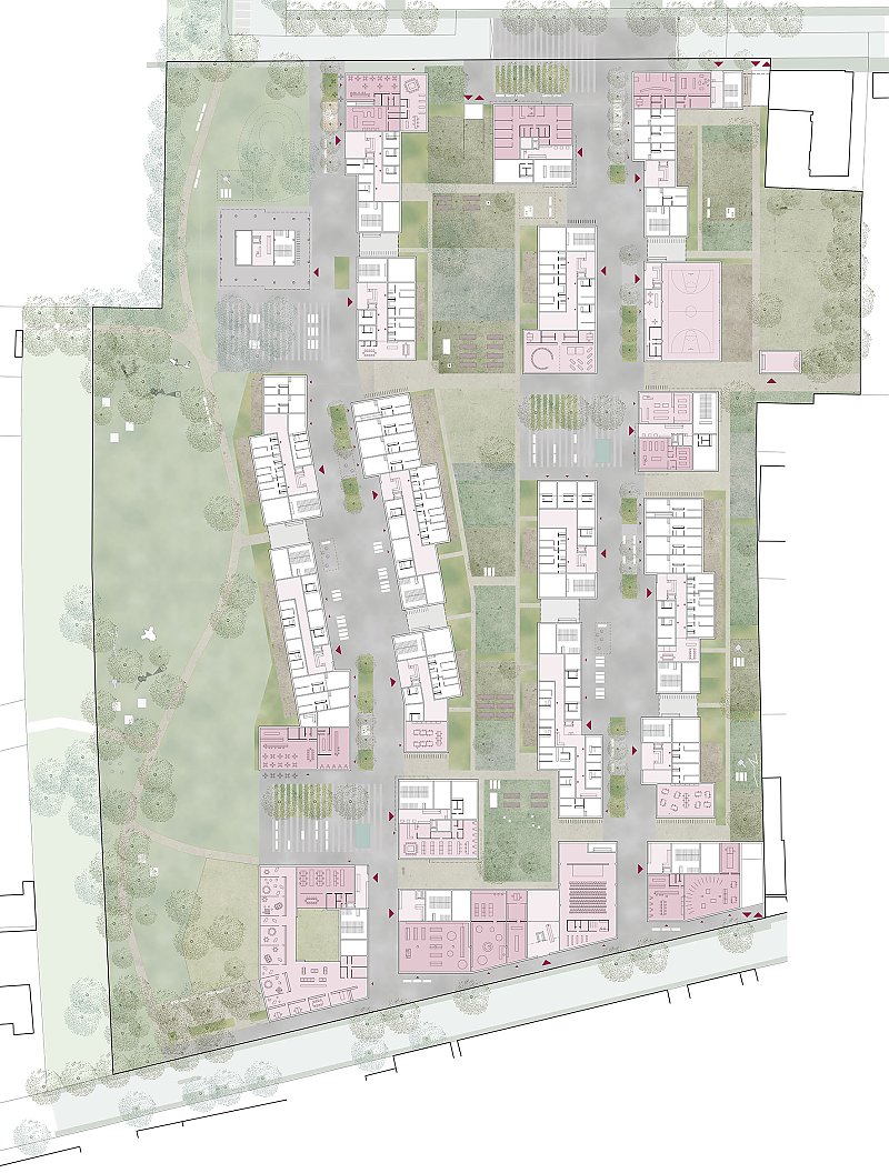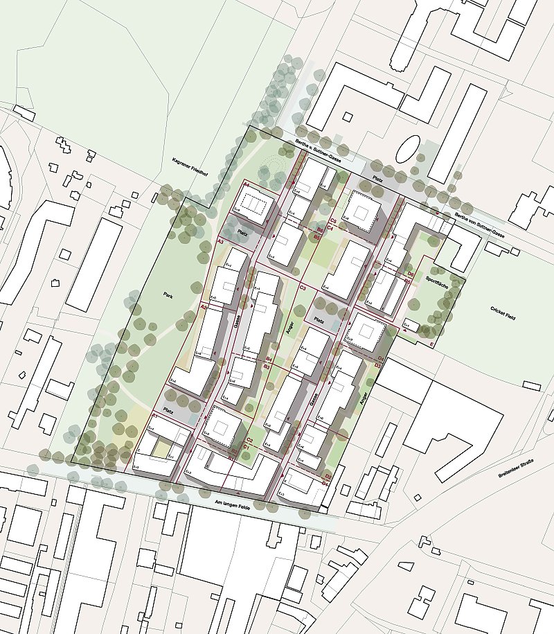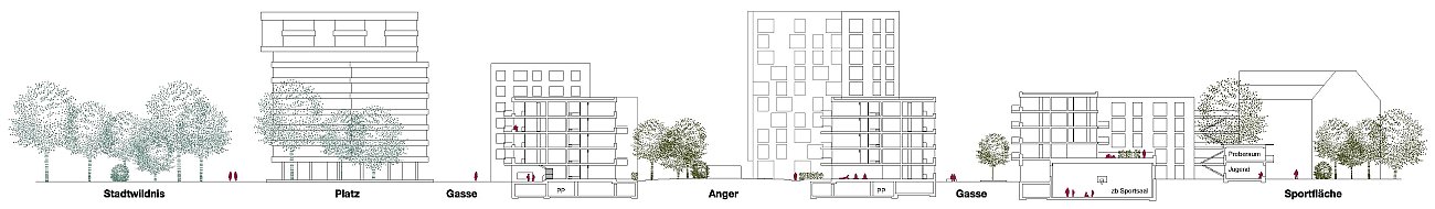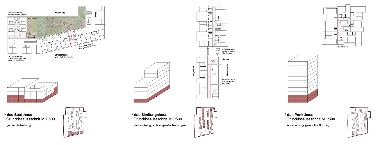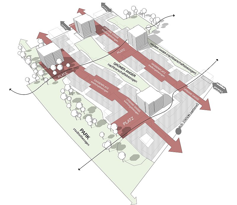 Diese Grundstruktur gliedert die Freiräume in unterschiedliche Typologien – den „Park“, den „Platz“, den „Anger“ –, schafft klare Erschliessungsräume – die „urbanen Gassen“ und spielt so attraktive Bauplätze in differenzierten Typologien frei – das „Stadthaus“, das „Siedlungshaus“, das „Punkthaus“. Die im Bebauungskonzept freigespielten Bauplätze können vielfältig und von unterschiedlichen Bauträgern und ArchitektInnen mit drei grundsätzlichen Gebäudetypen bebaut werden.