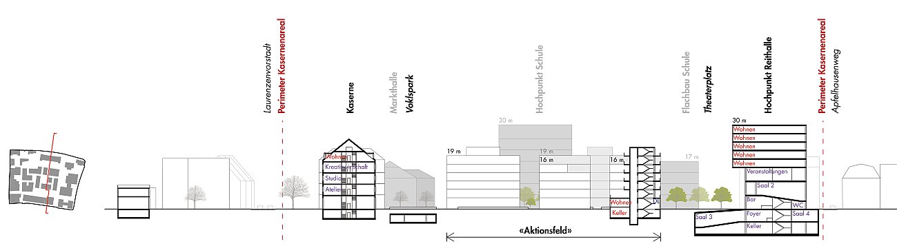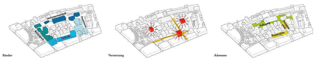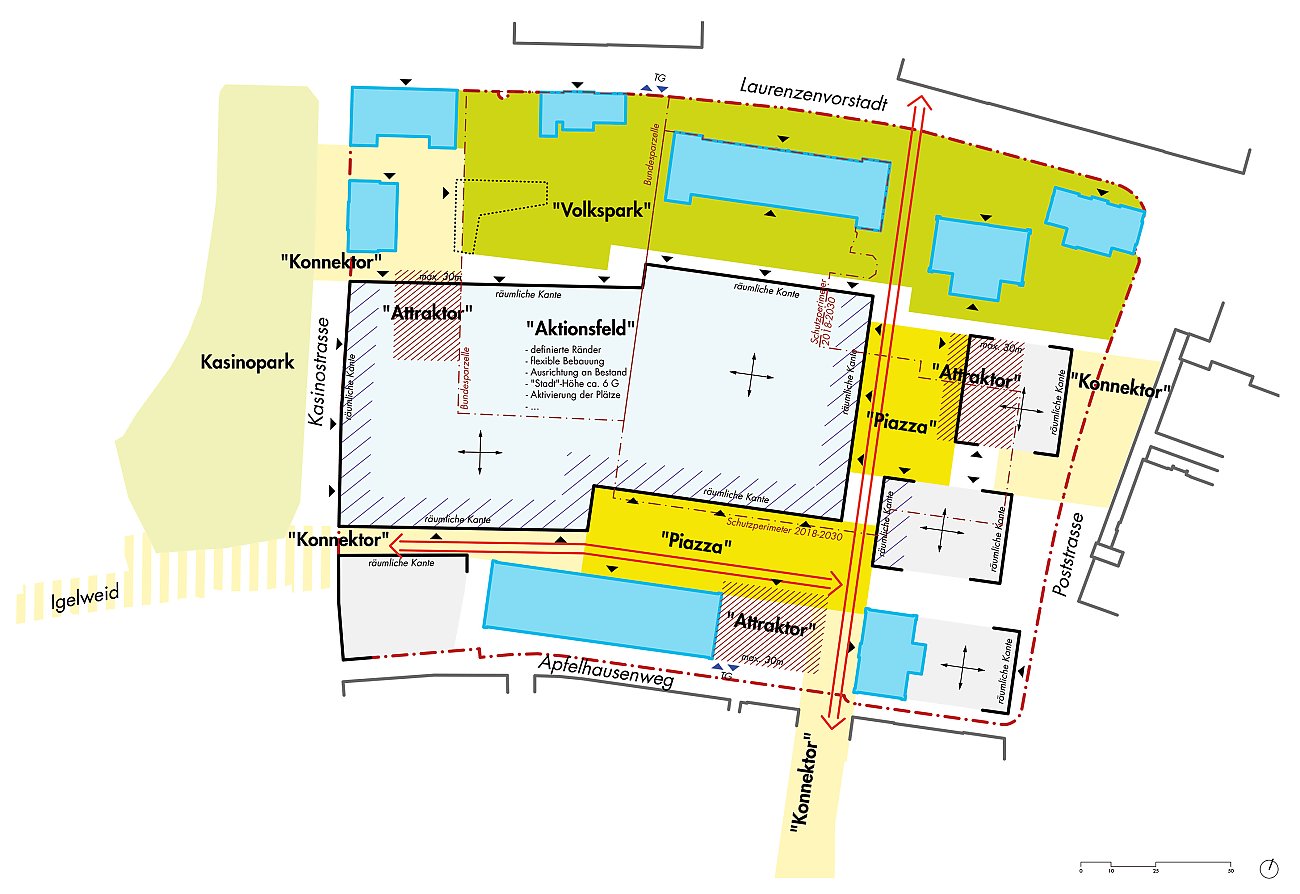 Das Areal und seine Transformation wird von den Rändern her gedacht und entwickelt. An der Laurenzenvorstadt werden die geschützten, repräsentativen Gebäude wieder freigespielt und öffentlich gemacht.
