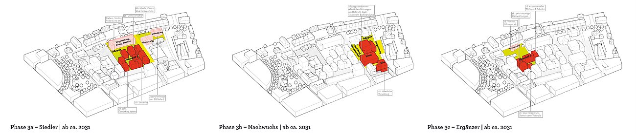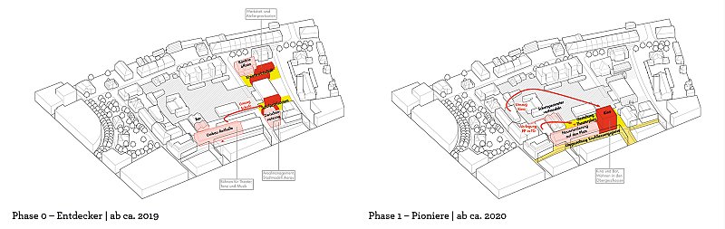 Das Areal ist ein vielfältig genutztes Stück Stadt. Gemäss dem Konzept entstehen verschiedene Schwerpunkte - das Kulturerlebnis im Süden, der Bildungsstandort im Osten und die Kulturproduktion im Norden. Das Aktionsfeld im Herzen des Areals bietet Raum für unterschiedlichste Stadt-Nutzungen.