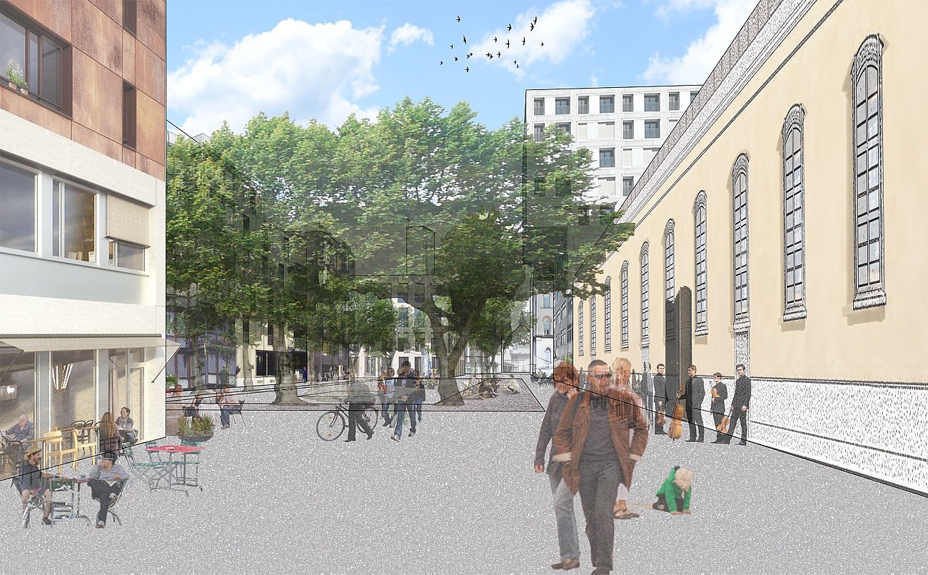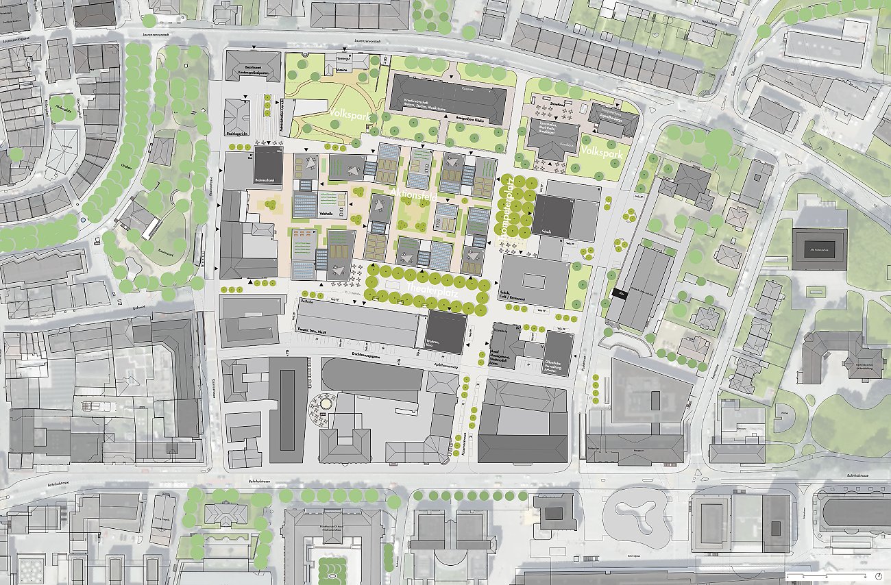 Drei verschiedene öffentliche Freiräume bilden klare Identitäten und Adressen. Der Volkspark umspielt die geschützten Bestandsbauten. Der Trompeterplatz spendet unter dem Baumdach Schatten und bietet Spiel- und Sitzflächen. Der Theaterplatz ist die Bühne für das abendliche Kulturpublikum.