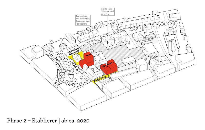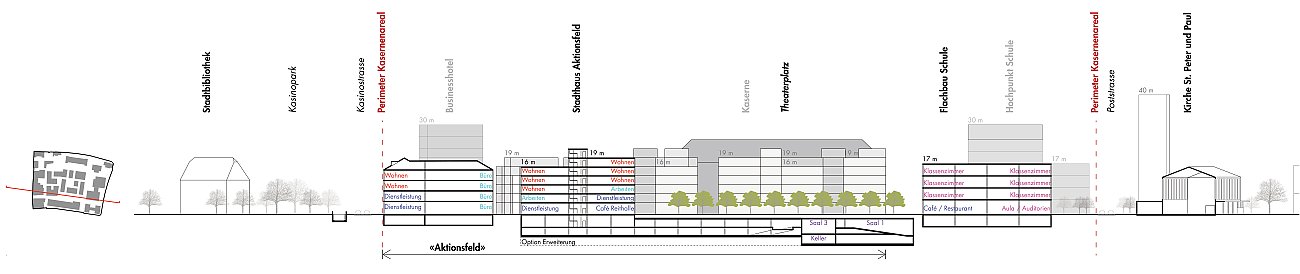 Das zentral gelegene Kasernenareal in Aarau hat verschiedene Interessens- und Zeithorizonte. Bis 2030 bleibt der zentrale Teil des Areals von der militärischen Nutzung besetzt und ist nicht öffentlich zugänglich. Die Flächen an den Rändern können jedoch ab 2018 unter Berücksichtigung der bestehenden Bauten und der Interessen der heutigen und zukünftigen Nutzer entwickelt werden.