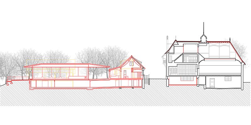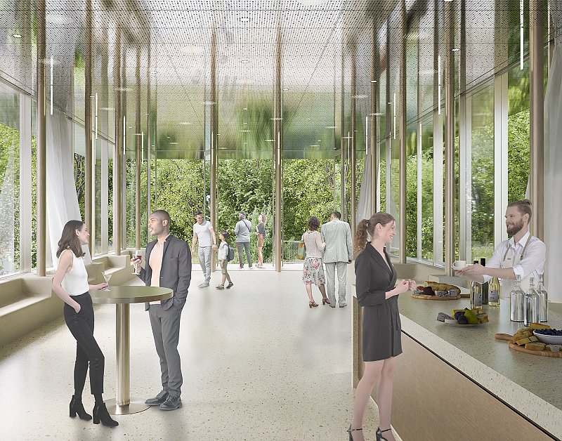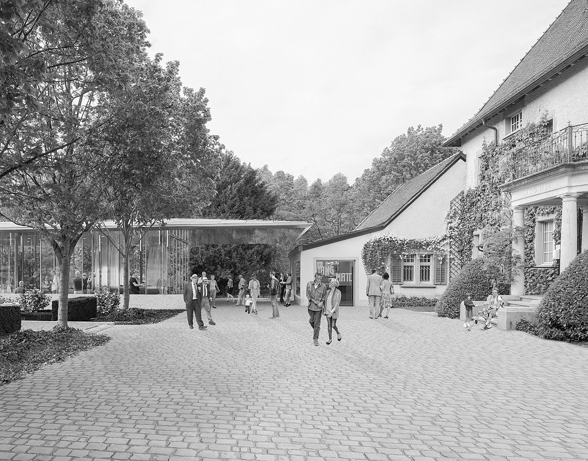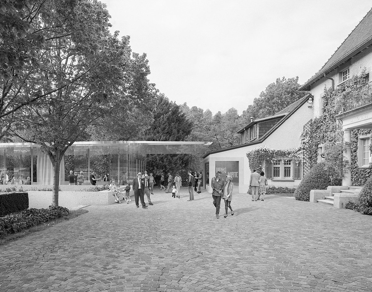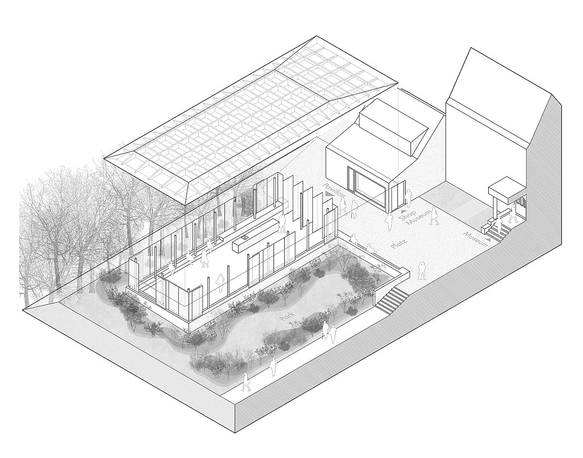 Die Malerei des Impressionismus ist geprägt von einer starken Hinwendung zur Landschaft bei der es den Künstlern darum ging, die Gegenwart in differenzierten Farbräumlichkeiten als «Netzhautbild» abzubilden. Diese «Auflösung im Abbild» ist Thema des neuen Pavillons. Eine Gartenmauer zum Sitzen in gestocktem pigmentiertem Beton fasst den neuen Vorplatz und bildet den Sockel des Pavillons. Ein schmal auslaufendes Dach, verkleidet mit poliertem Chromstahlblech welches die Veranstaltungen und die Landschaft «pointilistisch» reflektiert, steht auf runden Stützen aus Eichenholz. Es kragt zum ehemaligen Garagengebäude aus. Eine schiebbare Verglasung, begleitet von einem rundumlaufenden Vorhang bildet Witterungs- und Klimaschutz. Ein impressionistisches Gartenband begleitet die neue Gartenmauer und bildet so den Übergang in den Park.