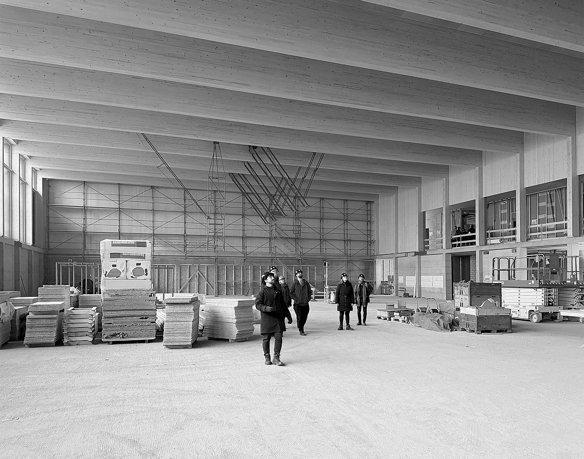 Die Dreifachturnhalle wird ohne zusätzlichen baulichen Aufwand zur vielfach nutzbaren Mehrzweckhalle: der Vorplatz zur Erachfeldstrasse erweitert die Nutzfläche in den Aussenraum und bietet einen niveaufreien Zugang für temporäre Infrastrukturen. Die Dreifachturnhalle ist als einfaches, kompaktes Volumen organisiert. Die Geräteräume, die Garderoben und die Gebäudetechnik sind auf drei Geschossen übereinandergestapelt und in Massivbauweise angedacht. Die Halle wird durch Rahmen aus feingliedrigen Holzstützen und Trägern gebildet.
