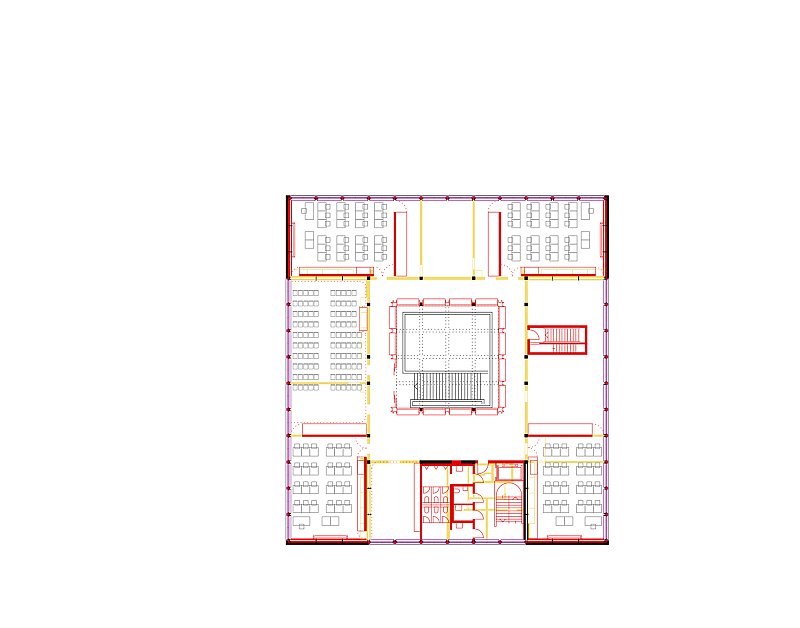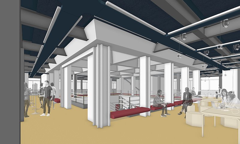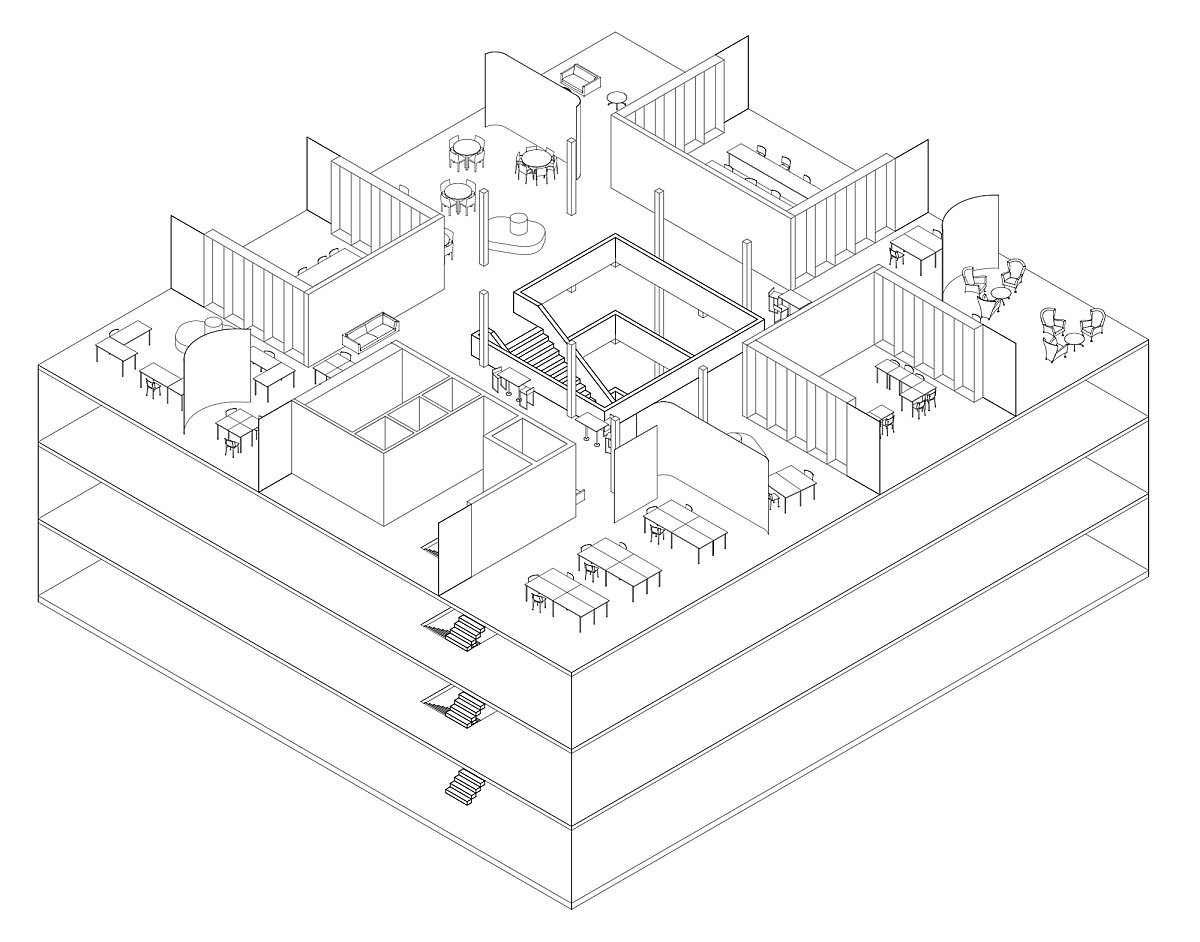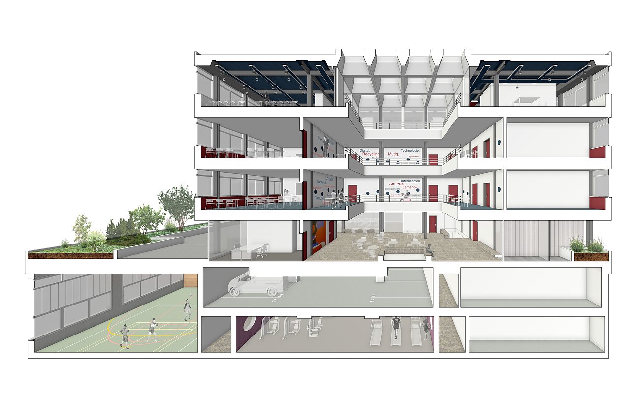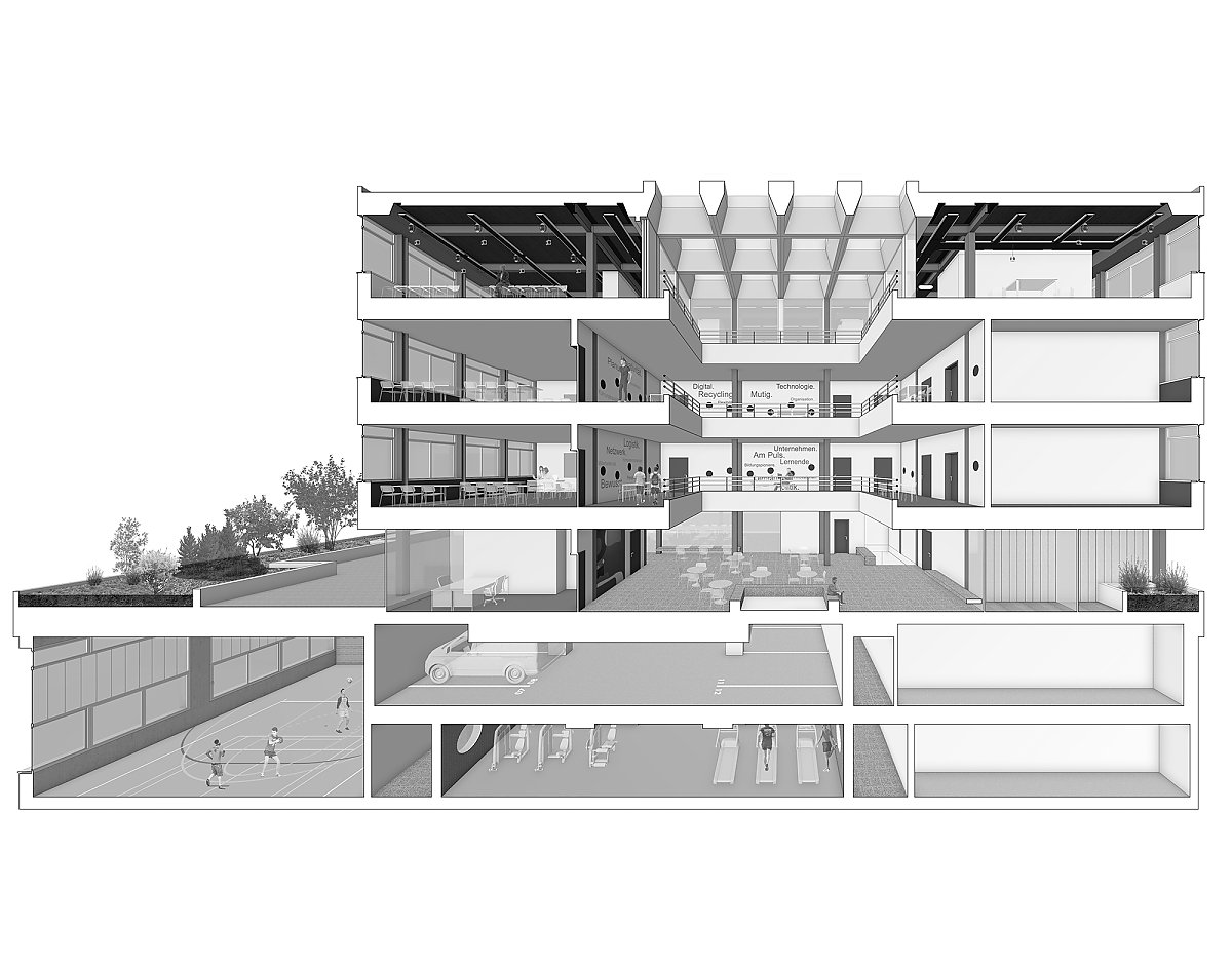 Neue didaktische Konzepte ermöglichen – Auf den Geschossen werden Lernlandschaften etabliert, gegliedert durch vier Raumnischen. Diese bilden Platz für ruhigeres Lernen. Zur Halle bestehen die Nischen aus den bestehenden Wänden, senkrecht zu ihnen stehen Möbelstrukturen, welche Platz für Infrastruktur (z.B. Garderoben, Kopiernischen, Bibliothek, etc.) bieten. Die Erschliessung erfolgt entlang der Fassaden, so wird die Halle für Lernnutzungen freigespielt. Mobile Trennwände und Vorhänge gliedern die Flächen flexibel und Infrastrukturinseln (Dockingstations, Wasserspender, etc.) ermöglichen informellen Austausch.
