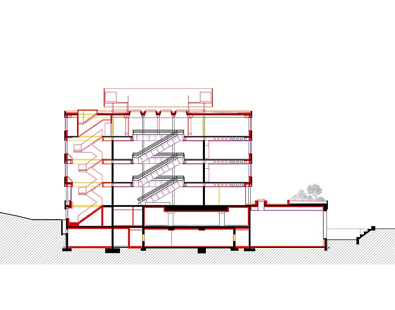 Eingriffe konzentrieren – Alle starken Eingriffe in die Struktur (Fluchttreppenhaus, Sanitärbereiche, etc.) werden konzentriert. Dies ermöglicht einen nachhaltigen und bewahrenden Umgang mit dem Bestand.