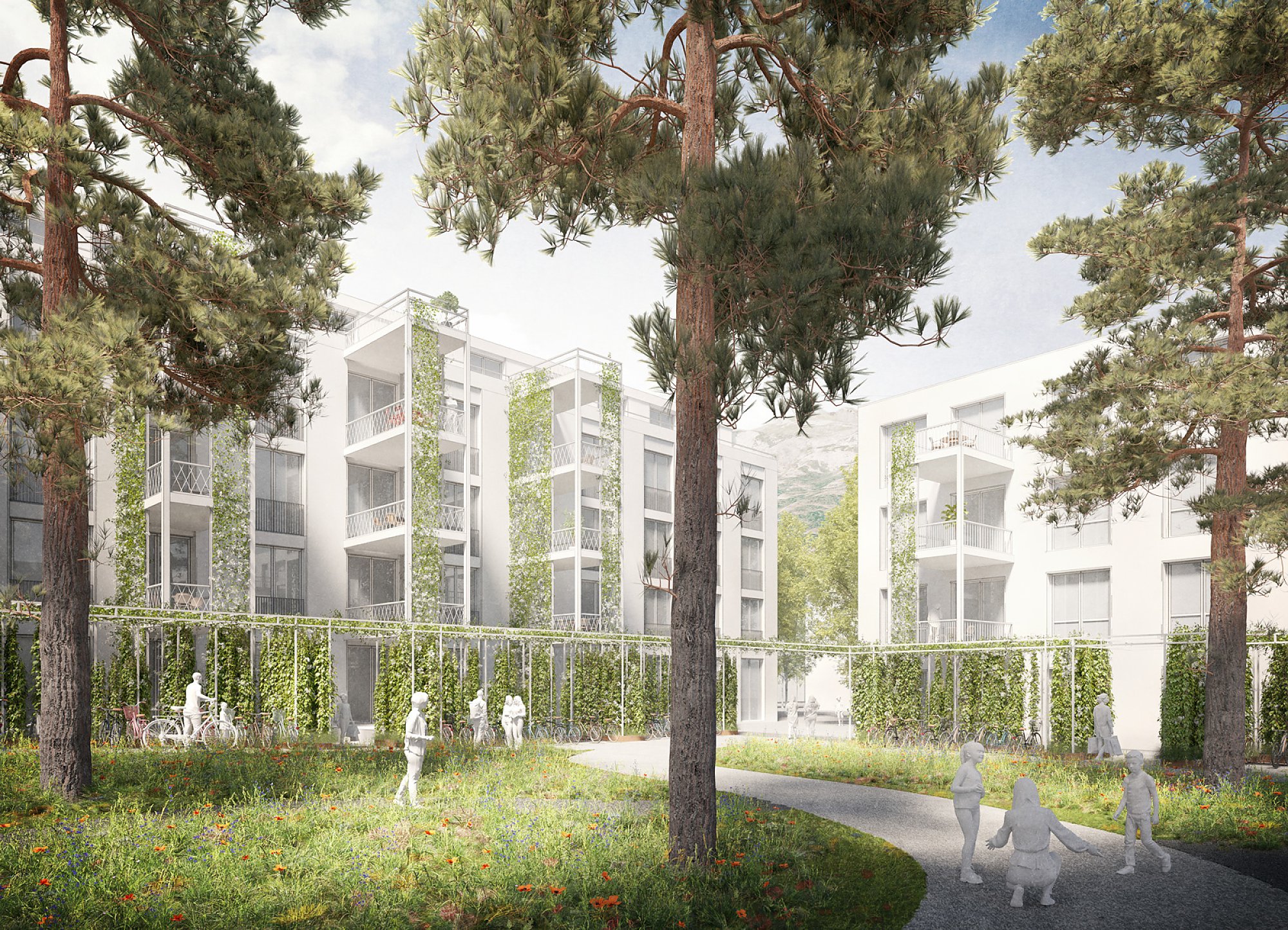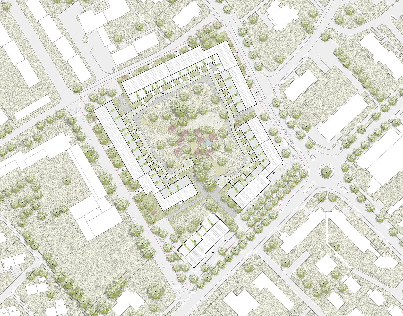 Das Aussenraumkonzept schafft im Zusammenspiel mit der Bebauung drei unterschiedliche Aussenraumstrukturen und -typologien: den gemeinsamen «Wohnpark» in der Mitte des Areals, die öffentlichen «Quartierplätze» an den Ecken des Areals und die «Vorgärten» entlang der umgebenden Strassenräume. Der Wohnpark ist eine grosszügige Freifläche für die Bewohner:innen des Areals. Sie ist zwiebelförmig strukturiert: entlang der Gebäude befinden sich private Vorzonen für die EG-Wohnungen, diese werden abgeschlossen durch ein beranktes Velodach, welches sich zu Gartenpavillons ausweitet und in der Mitte befindet sich eine grosse freie grüne Fläche zum Aufenthalt und Spielen – gegliedert durch Baumgruppen und Wegverbindungen. Der Wohnpark ist grösstenteils nicht unterkellert, grosse Bäume können wachsen und das Oberflächenwasser versickern. Die Fläche liegt über dem umgebenden Strassenniveau, so wird der gegenüber dem Strassenraum erhöhten Privatheit Ausdruck verliehen.