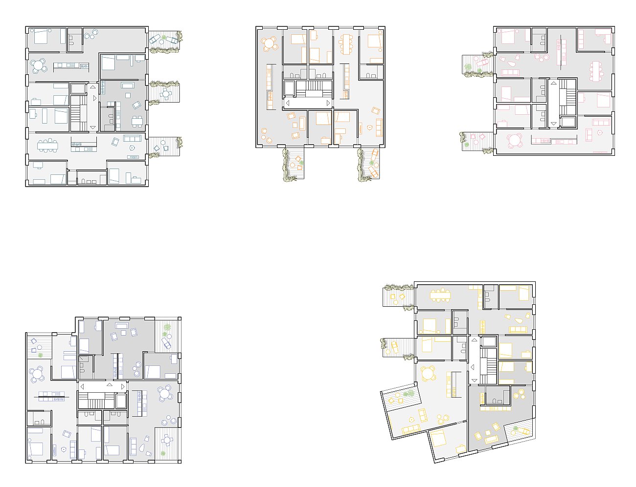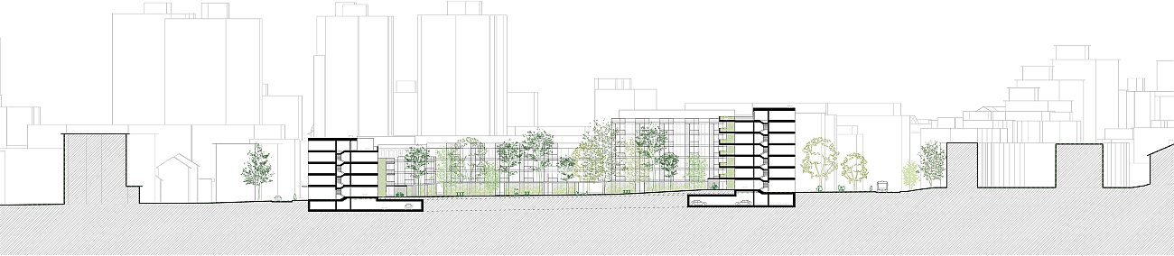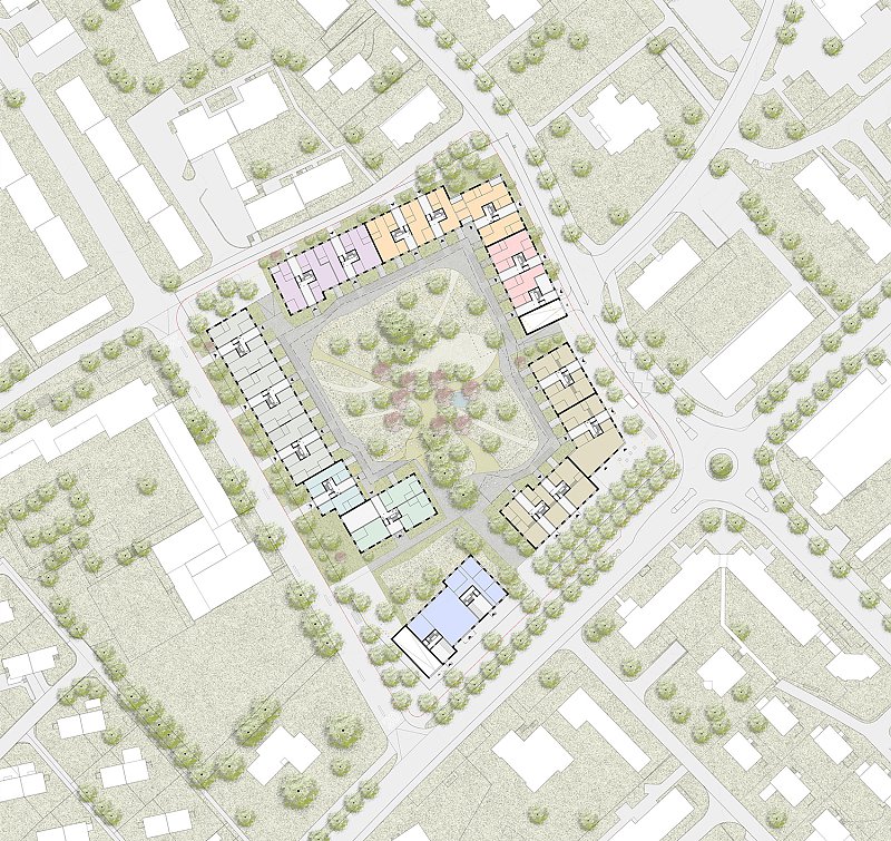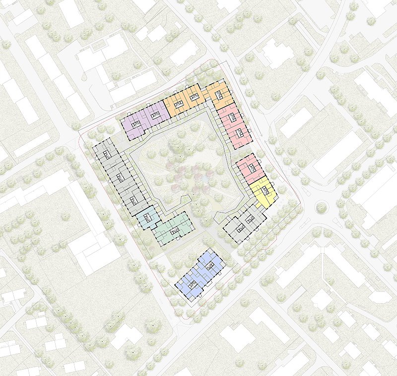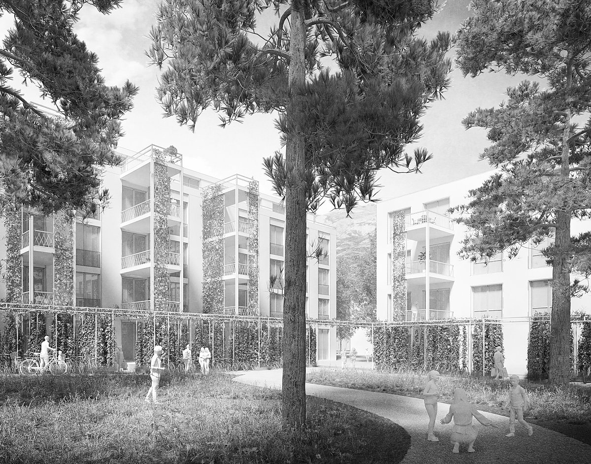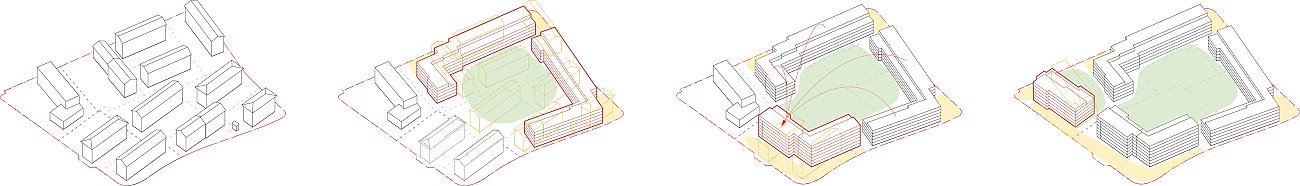 Drei Winkelbauten schaffen zusammen einen gemeinsamen Binnenraum für alle Bewohner:innen. Vorgestellt wird diesen Bauten ein Ring aus «Parklauben», welche die gesamte Bebauung zusammenhalten. Dabei können diese Lauben und die Bebauung selbst von den unterschiedlichen Bauträgern innerhalb eines Regelwerks architektonisch differenziert ausgeführt und so auf die jeweiligen Bedürfnisse angepasst werden. So entsteht ein individuelles Bild in einem gemeinsamen Rahmen. Die Dimensionierung der Bauten ermöglicht einen preiswerten Wohnungsbau. Einfache Kubaturen, optimierte Spannweiten und klare Strukturen sind dabei die Basis für die weiteren architektonischen Planungsschritte.