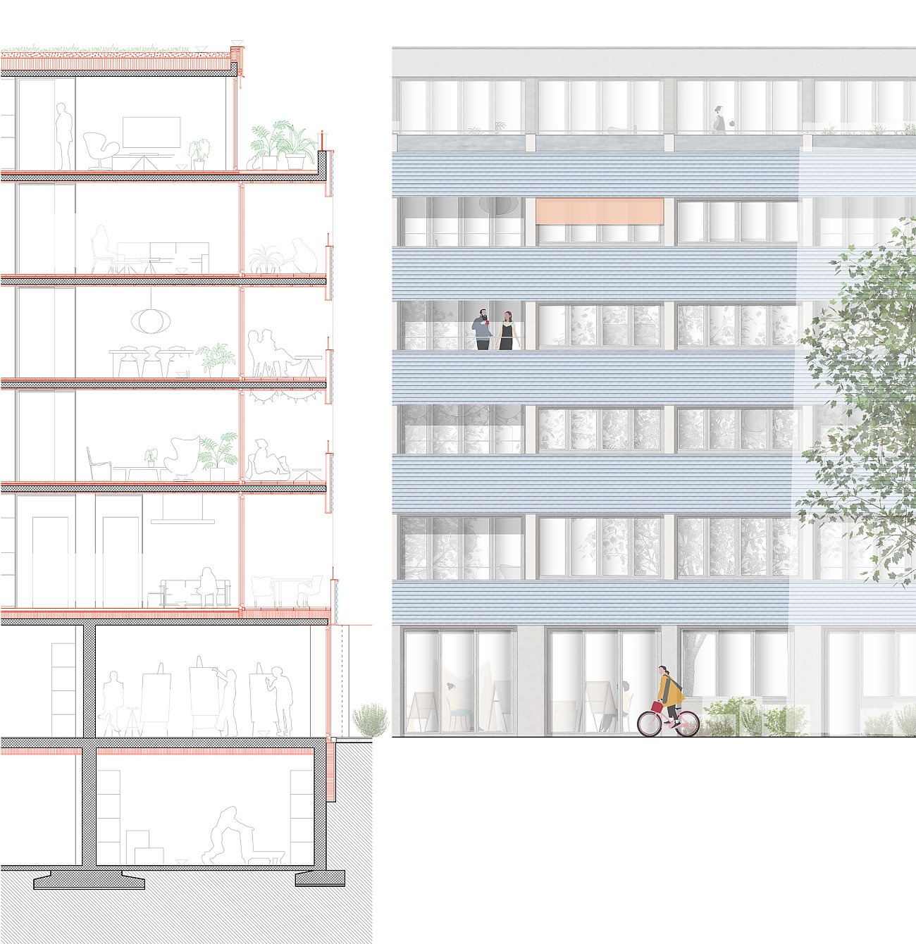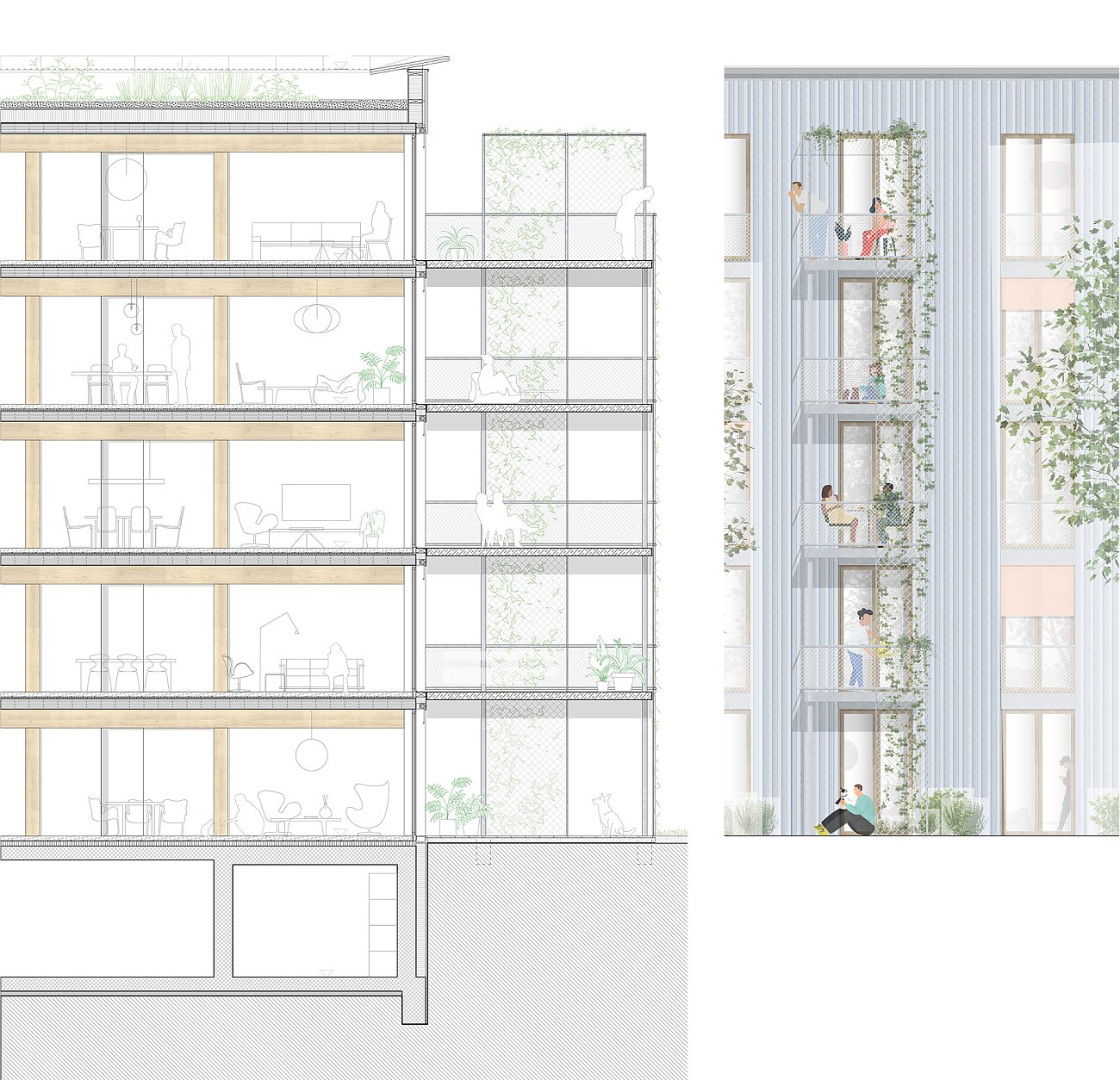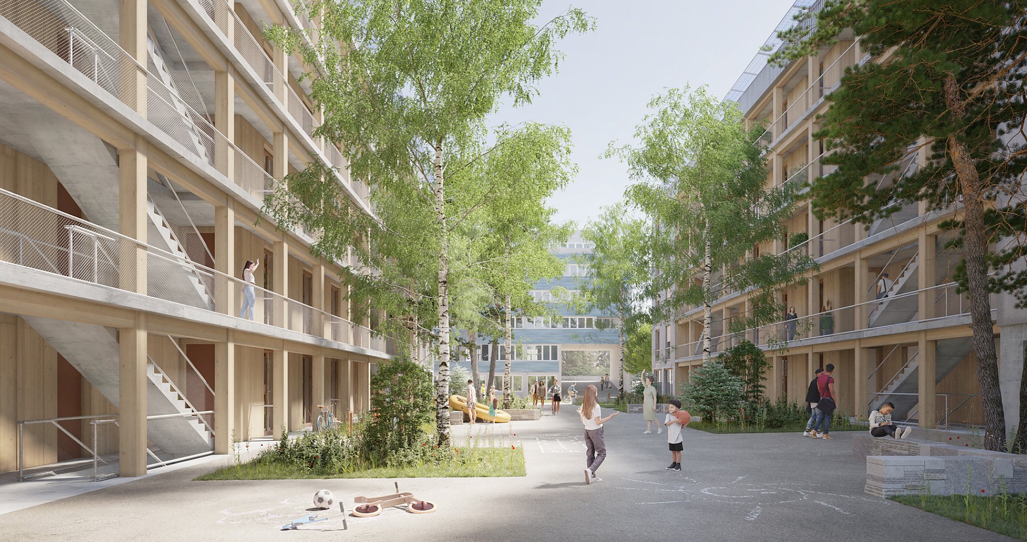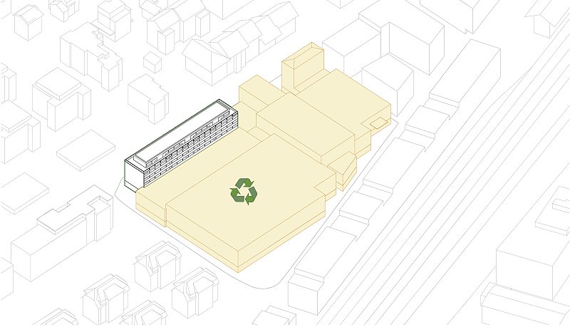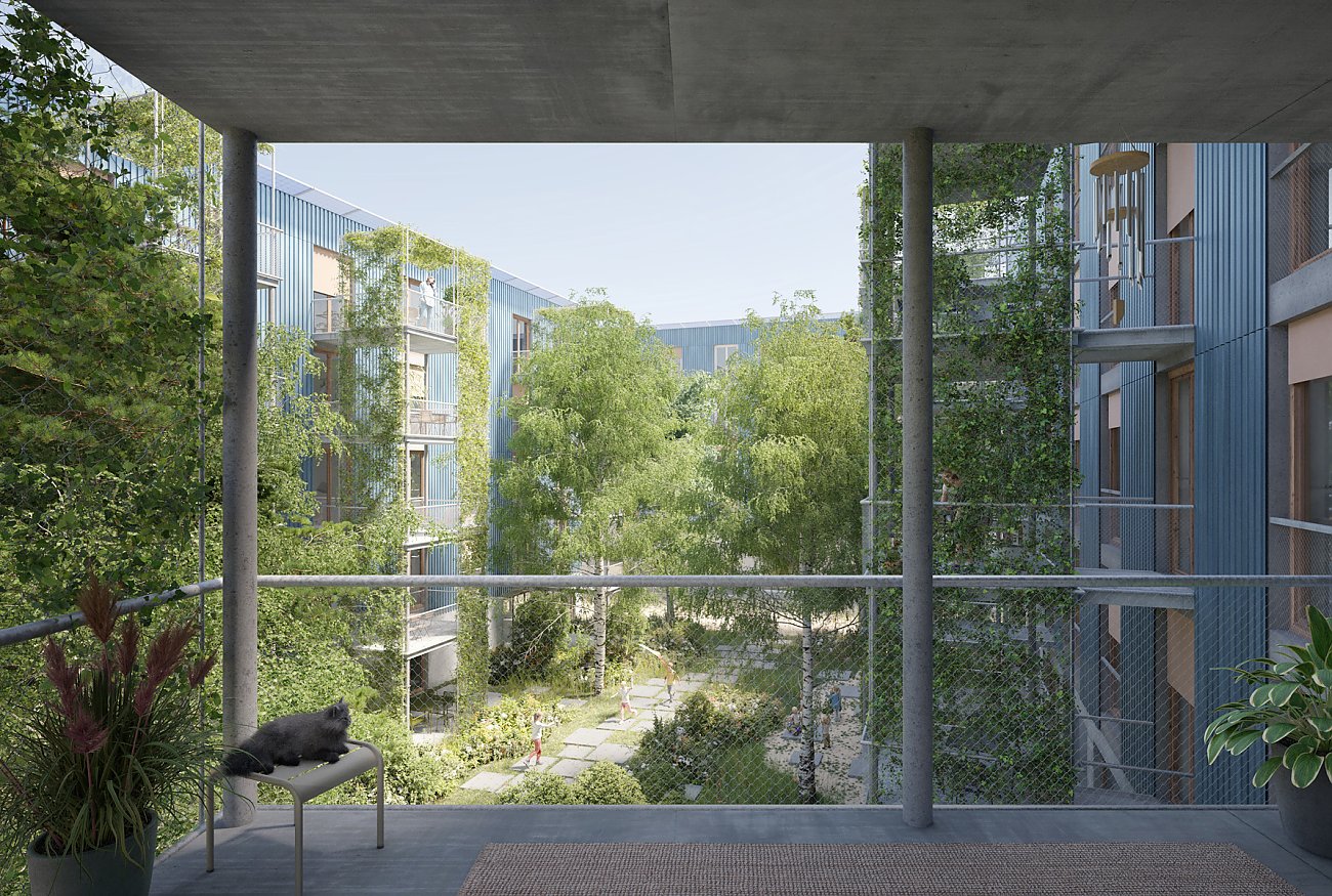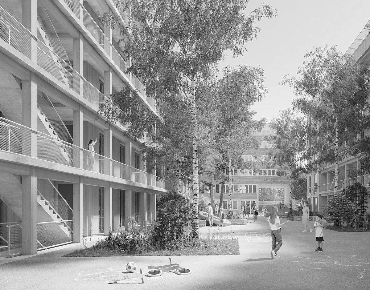 Der Erhalt und die zurückhaltende Umnutzung des bestehenden Wohn- und Geschäftshauses trägt zur charaktervollen Identität mit identitätsstiftender Adressbildung bei, unterstützt die Vielfältigkeit der Typologien und setzt ein Zeichen für eine zukunftsorientierte Arealbebauung. Die neuen Gebäude in Holzbauweise sind mit wiederverwendeten Blechen der rückgebauten Hallen verkleidet, in den witterungsgeschützten offenen Treppenhäusern und Loggias werden die Holzelemente auch in der Fassade sichtbar. An den halböffentlichen Gassen sind die privaten Aussenräume als eingezogene Loggias formuliert, in den beiden Gärten stehen sie in Form von Laubentürmen mitten im Grün.