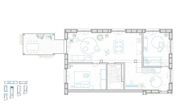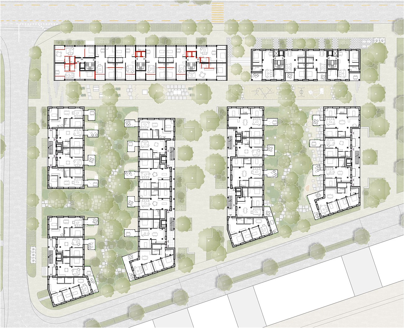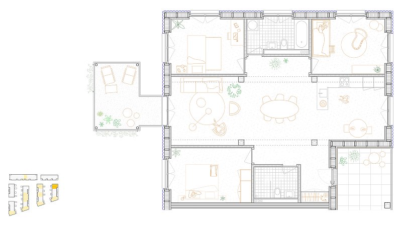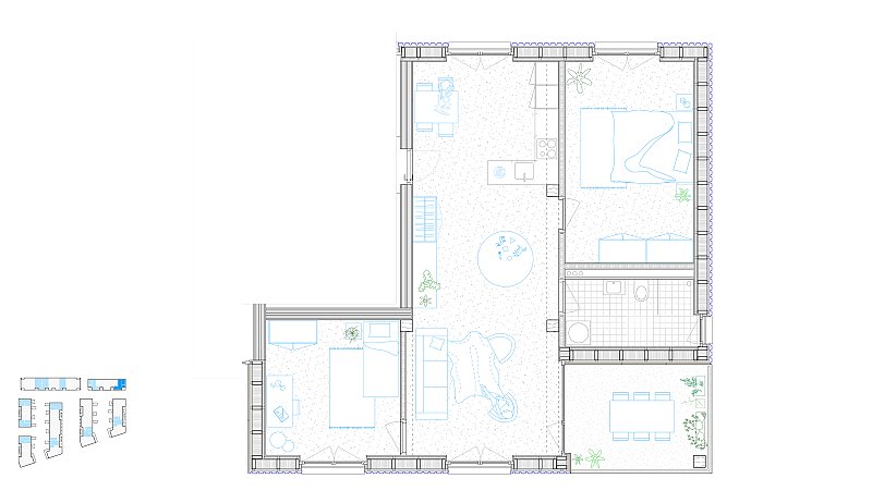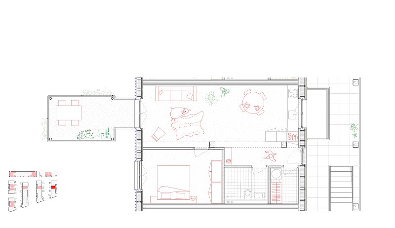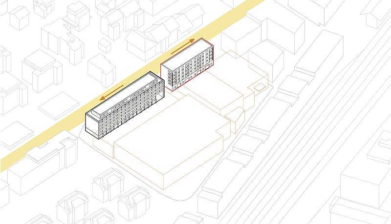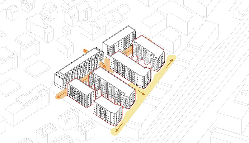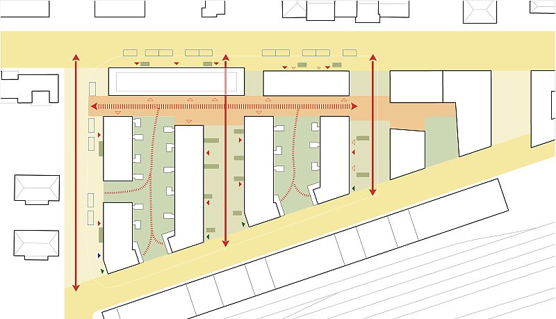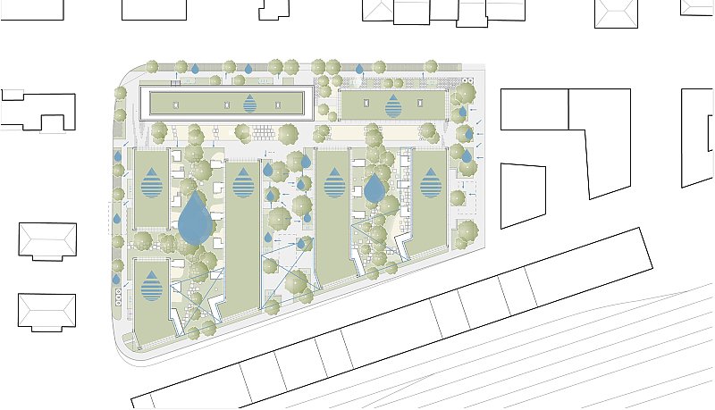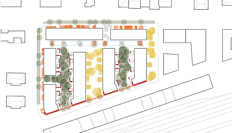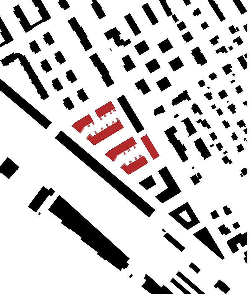Beim Bahnhof Wettingen wird anstelle einer Gewerbeliegenschaft ein Wohnumfeld von hoher Qualität geschaffen: die Gassen quer zur Seminarstrasse sind als begrünte Höfe geplant, mit einer inneren Achse wird ein Treffpunkt für das Quartier geschaffen und die halbprivaten Binnenräume werden als intensiv begrünte Gärten gestaltet. Es entsteht eine klare Hierarchie der Adressierung sowie eine Abstufung der Öffentlichkeit, die sich selbstverständlich in den städtebaulichen Kontext integriert.